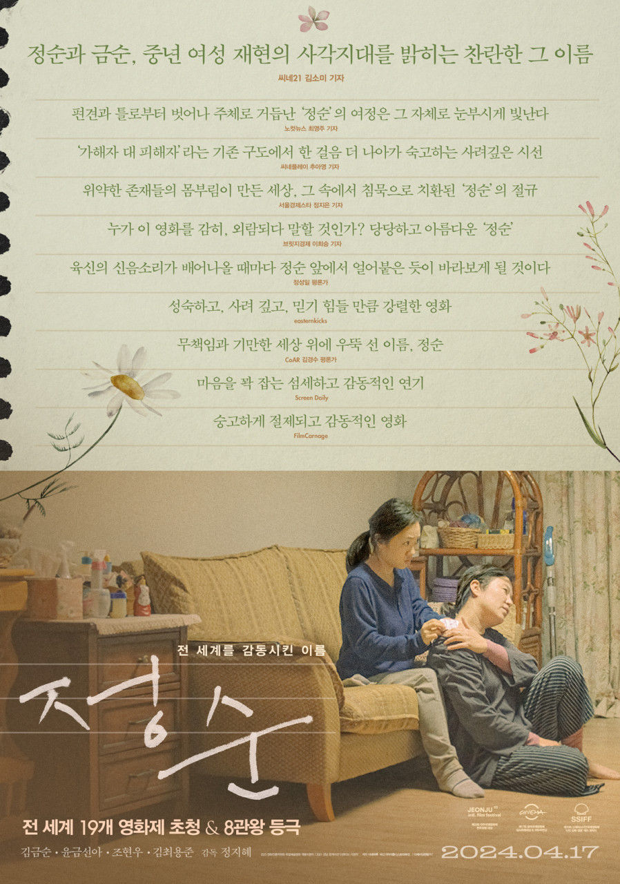 <정순> 은 2024년 4월 17일 개봉한 한국 영화로, 정지혜 감독이 각본과 연출을 모두 맡았습니다. 15세 이상 관람가이며, 러닝타임은 104분입니다. 현재 넷플릭스에서 스트리밍 중이니 언제든 편하게 감상할 수 있답니다! 😉