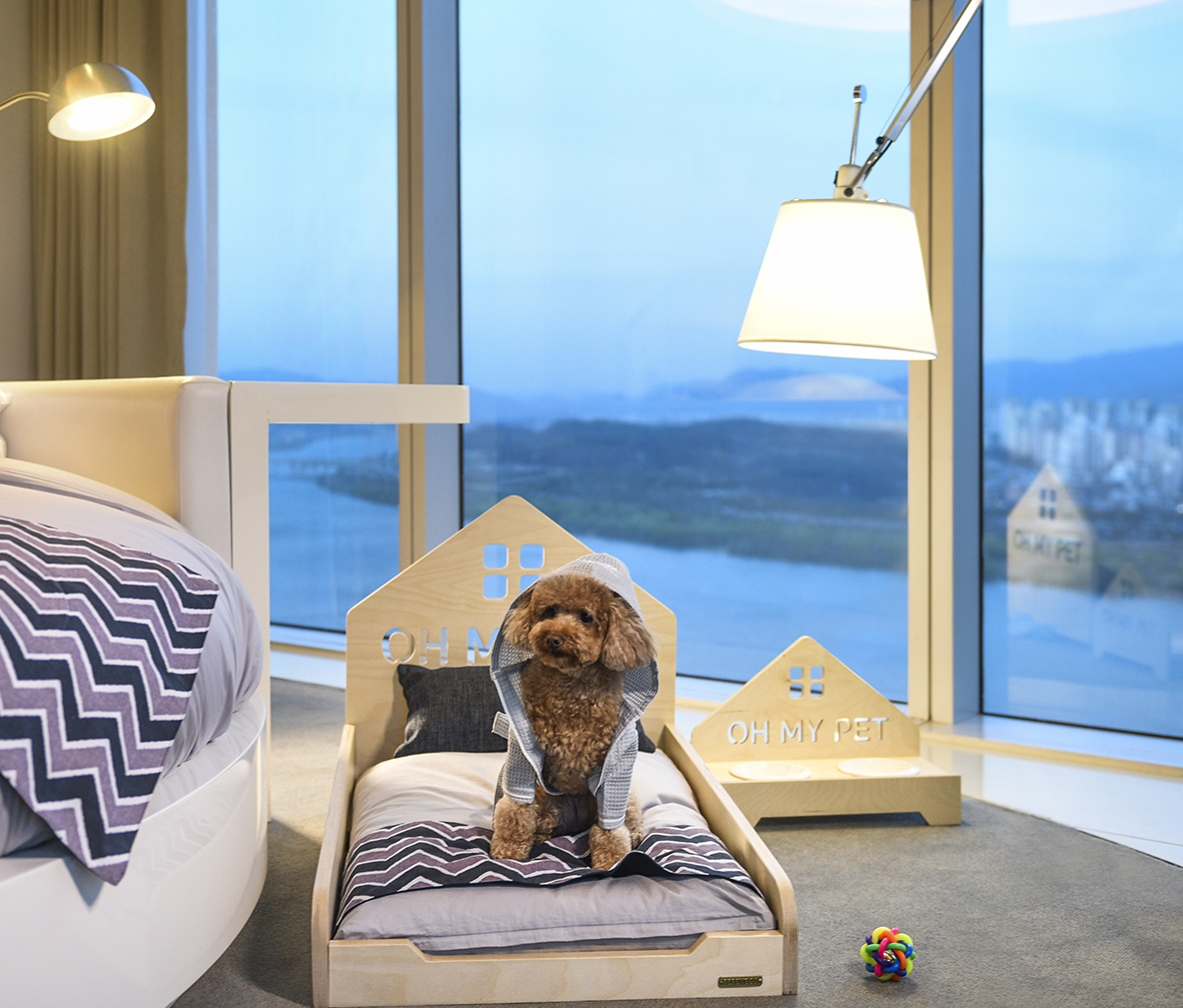 -오 마이펫 프로그램으로 반려견을 위한 전용 침대와 쿠션, 음식, 물그릇, 식탁, 가운, 타월 외에도 웰컴키트로 장난감과 펜던트, 배변봉투 및 패드가 준비되어 있습니다..