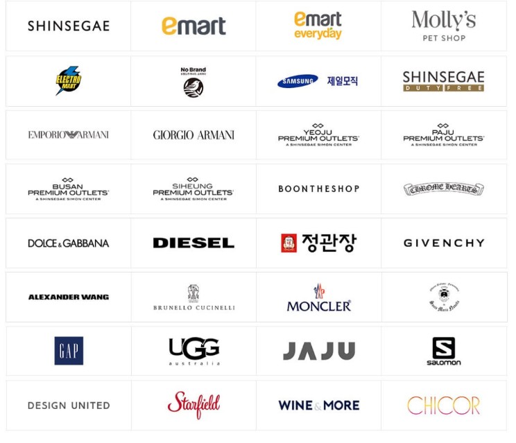 - 쇼핑: 신세계백화점, 이마트, 트레이더스, 스타필드, 신세계면세점, SSG닷컴 오프라인 매장, 프리미엄 아울렛, 일렉트로마트, 노브랜드 등