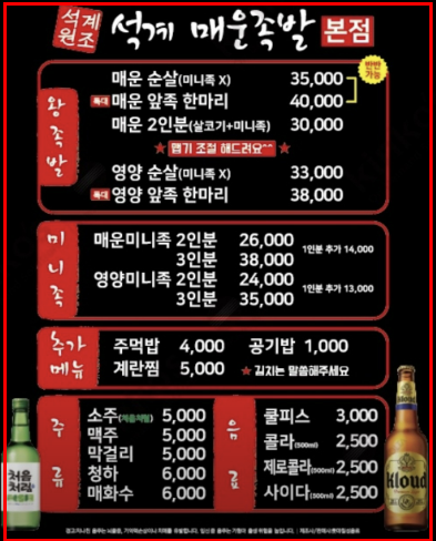 | 항목 | 신당동 매운 닭발 | 석관동 매운 족발 |