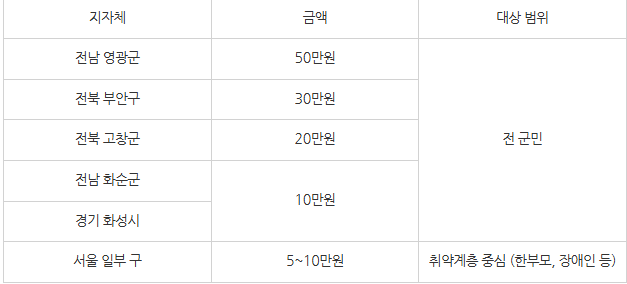 - 지급 방식: 지역화폐, 현금 계좌입금, 선불카드 등 다양
